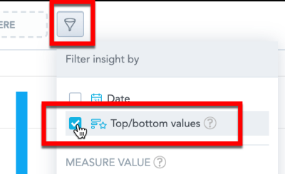 Each insight with at least one item in the Measures section and one attribute or date (in other than the Measures section), except Headlines, can have one top/bottom value filter. The filter is applied after the date, measure value, and attribute filters.