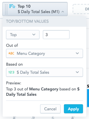You want to see which are the top five menu categories that has sold best—select Top 5 out of All based on Daily Total Sales.