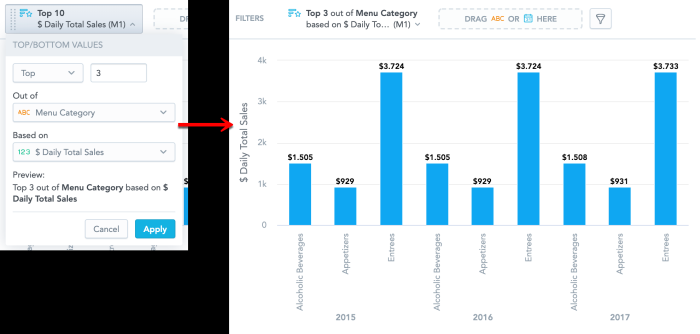 You want to see which are the top three menu categories that sold best each year. Select Top 3 out of Menu Category based on Daily Total Sales.