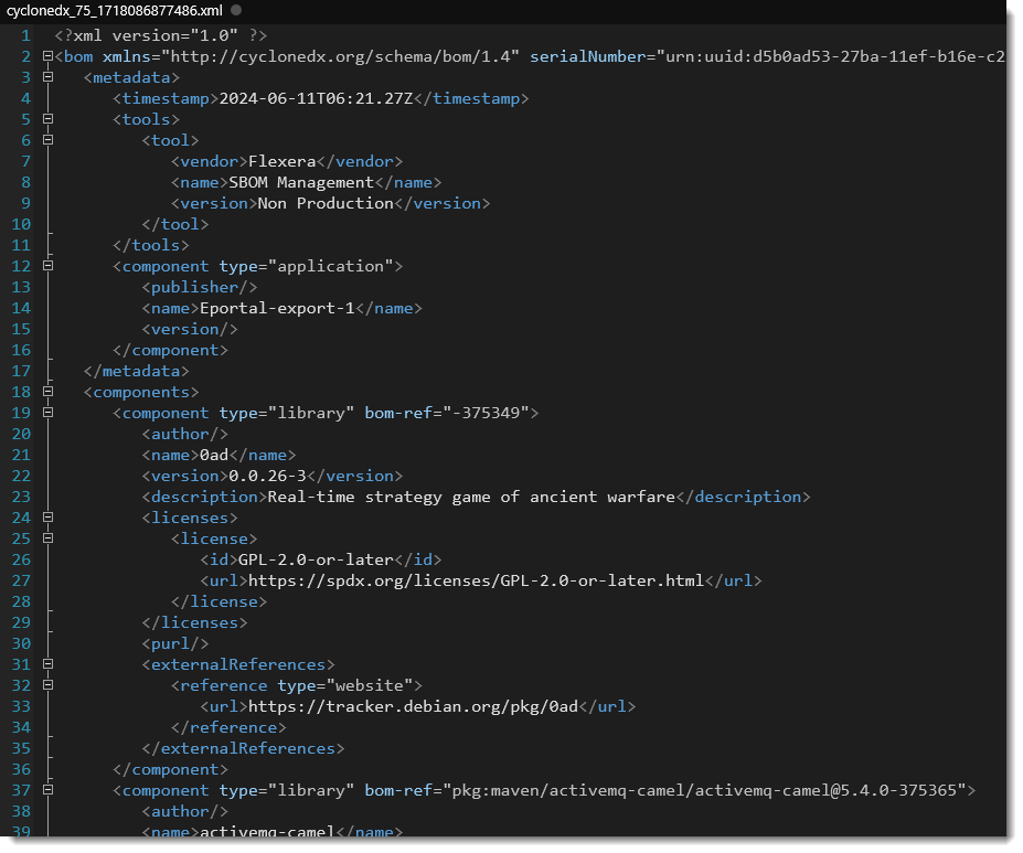 The following is an excerpt from an example SBOM report in regular CycloneDX format (.xml).