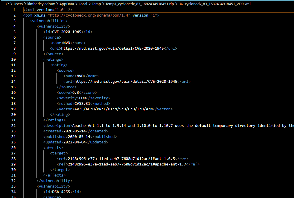 The CycloneDX VDR (Vulnerability Disclosure Report) provides details for all security vulnerabilities (including vulnerability exclusions) associated with SBOM parts in the bucket. The report is organized by vulnerability and, for a given vulnerability, identifies the parts with which vulnerability is associated (along with providing other details). The following shows an excerpt from an example VDR.