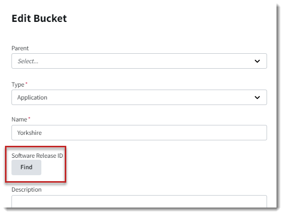 2. On the Create Bucket or the Edit Bucket slideout, locate the Software Release ID field. If necessary, refer to the instructions in Creating a Bucket or Editing a Bucket for accessing either slideout.