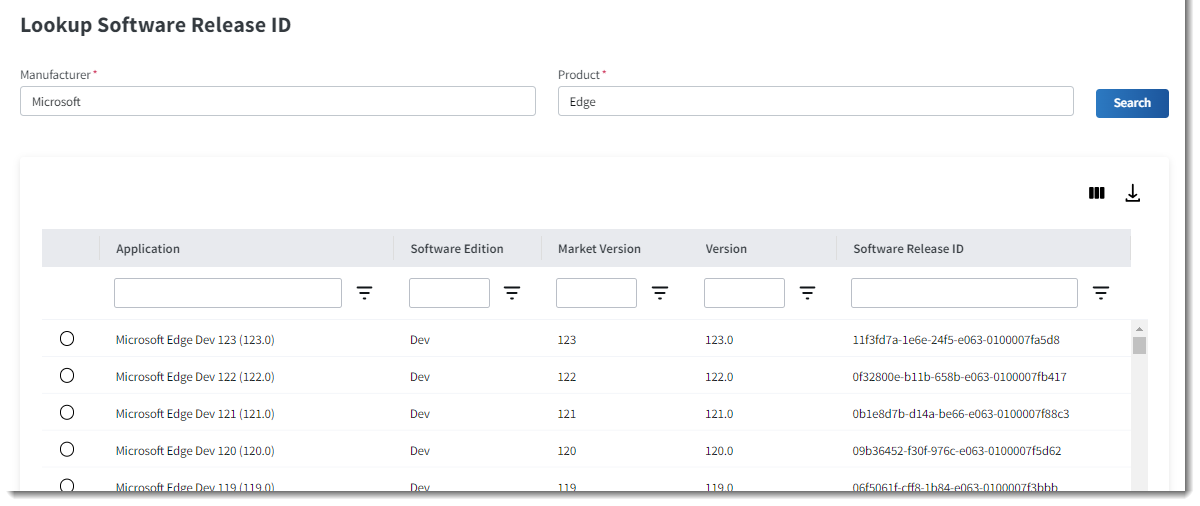 8. Click Select to return to the bucket definition. The Software Release ID field displays the correct Technopedia release ID for the application you selected.